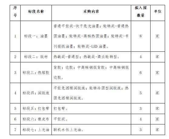 三、征集項目簡介:本項目征集人為中南出版傳媒集團股份有限公司(以下簡稱“征集人”),湖南省印刷物資有限責任公司(以下簡稱“采購人”)根據征集結果實施采購,承擔框架協議和采購合同的簽訂與執行。本次采購范圍為主要印刷輔料,涵蓋油墨、版材、熱熔膠、潤版液、打包帶、橡皮布、上光油七大類,劃分為7個標段。若某標段通過資格審查的供應商數量小于擬入圍家數,為保證項目競爭性,推薦入圍供應商數量縮減為N-1,其中N是指通過資格符合性審查的供應商的數量,征集人也有權針對該標段重新組織采購。具體標段劃分如下: